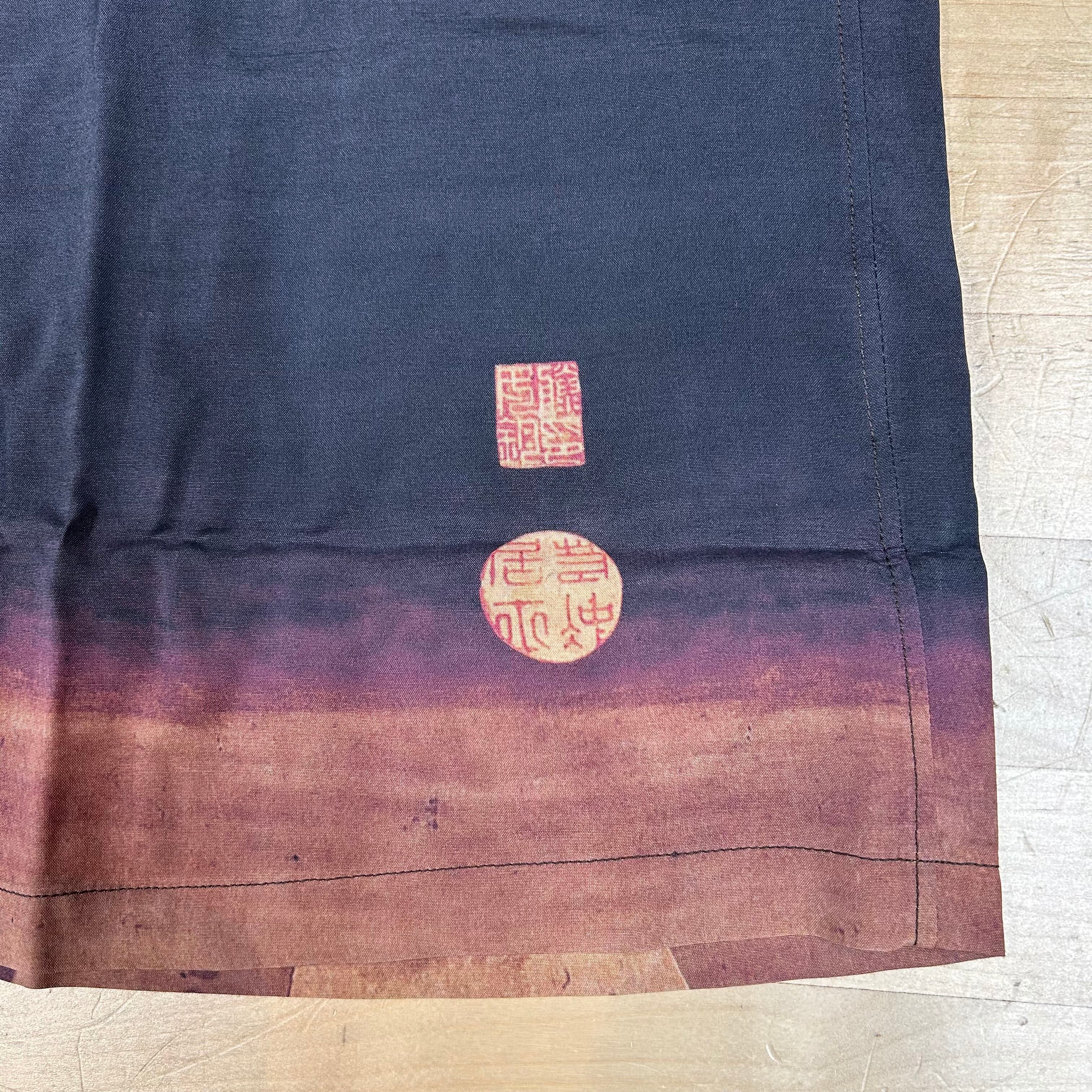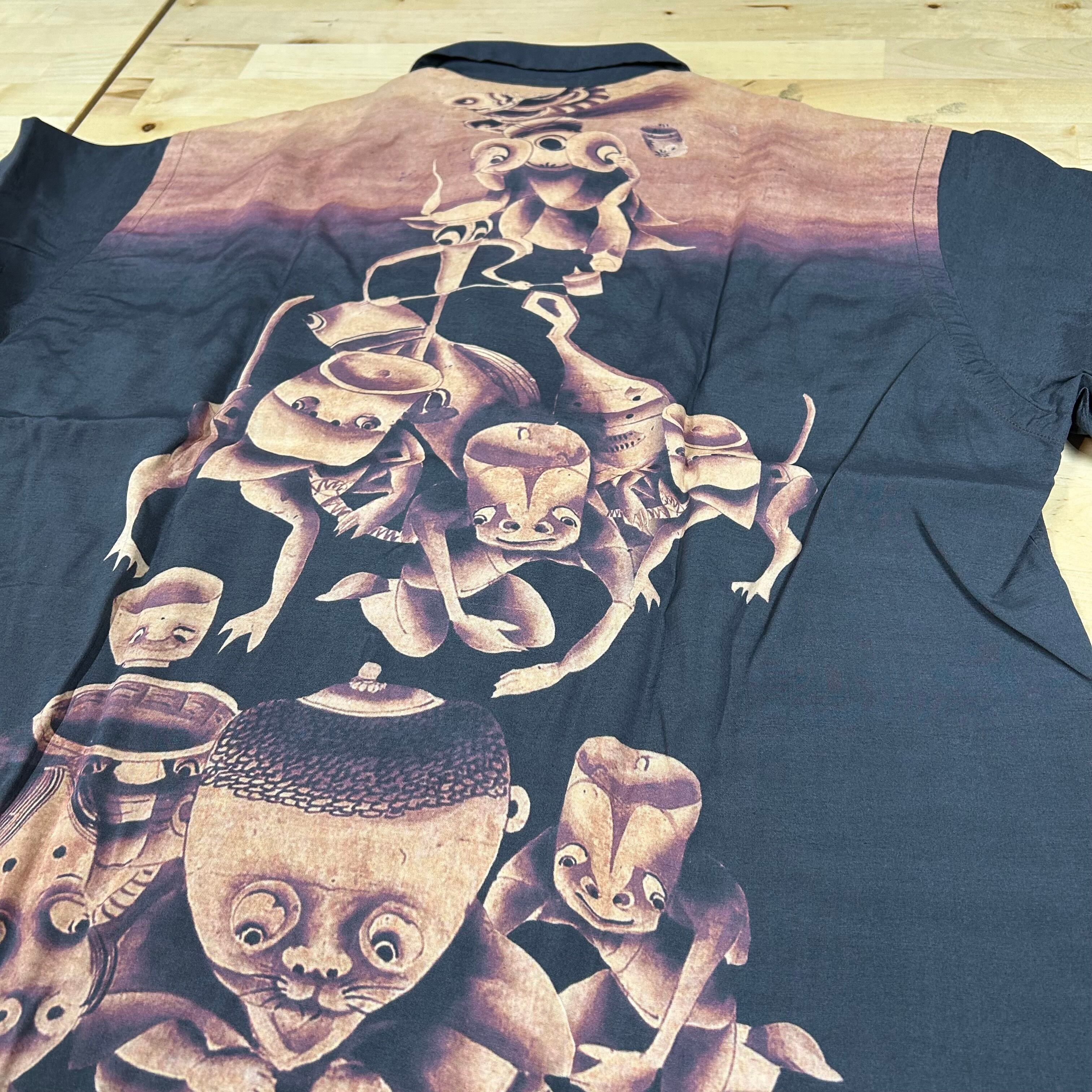 伊藤若冲は1716年、京都の青物問屋に生まれるが、絵を描くこと以外に興味が無く、家業を放棄して山に籠ることもあった。その類稀なる才能は奇抜な発想として作品に現れ、現代でも人々を魅了している。今回、伊藤若冲の作品をアロハシャツとして表現するにあたり、原画名を冠した「付喪神図」では、前後の違いを楽しめるよう強弱をつけてモチーフを配置。落款や外枠の縞模様なども加え、1950年代のテイストに仕上げた。