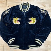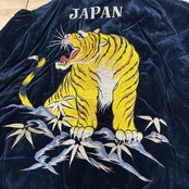 岩場に鎮座する虎を描いた作品。マットなダークネイビーの別珍生地に光沢感のあるレーヨン糸のイエローが際立っている。程よくデフォルメされた虎の刺繍は他のヴィンテージスカジャンの刺繍に比べて一回り大きく、インパクトある仕上がり。特徴的な書体の「JAPAN」の文字や、通常より縦に長い袖の昇龍もポイント。