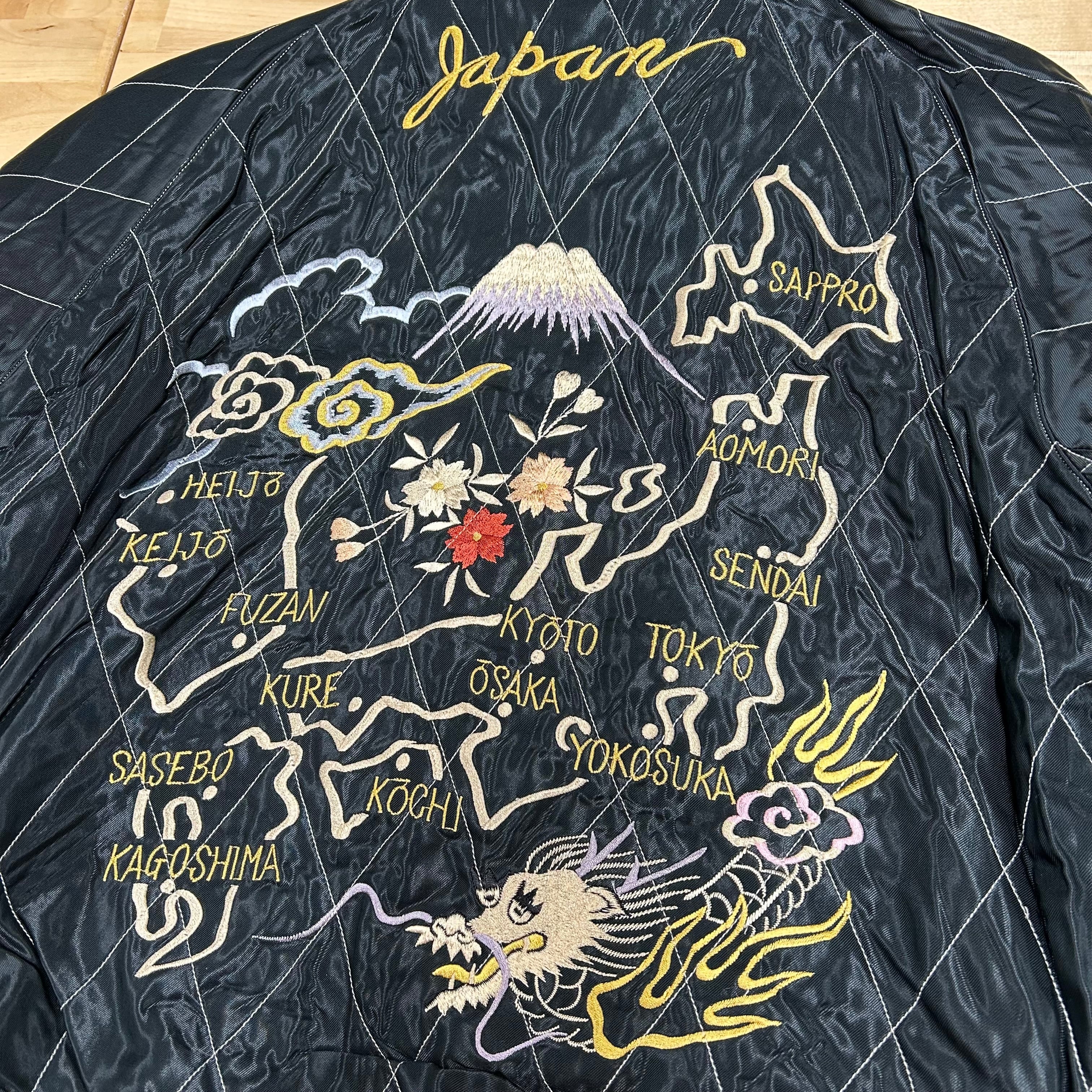 リバーシブル面はブラックの単色ボディに日本地図を描いたジャパンマップ柄。朝鮮半島も併せて描かれていることから1950年代中期の作品であることがわかる。富士山や龍などのモチーフも加え、赤い桜を背面の中心に配してアクセントとしており、その完璧なバランスに当時の職人のセンスが感じられる。
