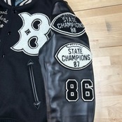 チームを象徴するキツツキのシニールが、このジャケットのハイライトといえる作品。アイコニックなキャラクターと「TOUCH DOWN」の文字を組み合わせたデザインはじつにアメリカらしく、 ユーモアに富んだ選手が考案したものと推測できる。このようなチームのシンボルを自身のジャケットに縫いつける文化は代々伝わってきた。