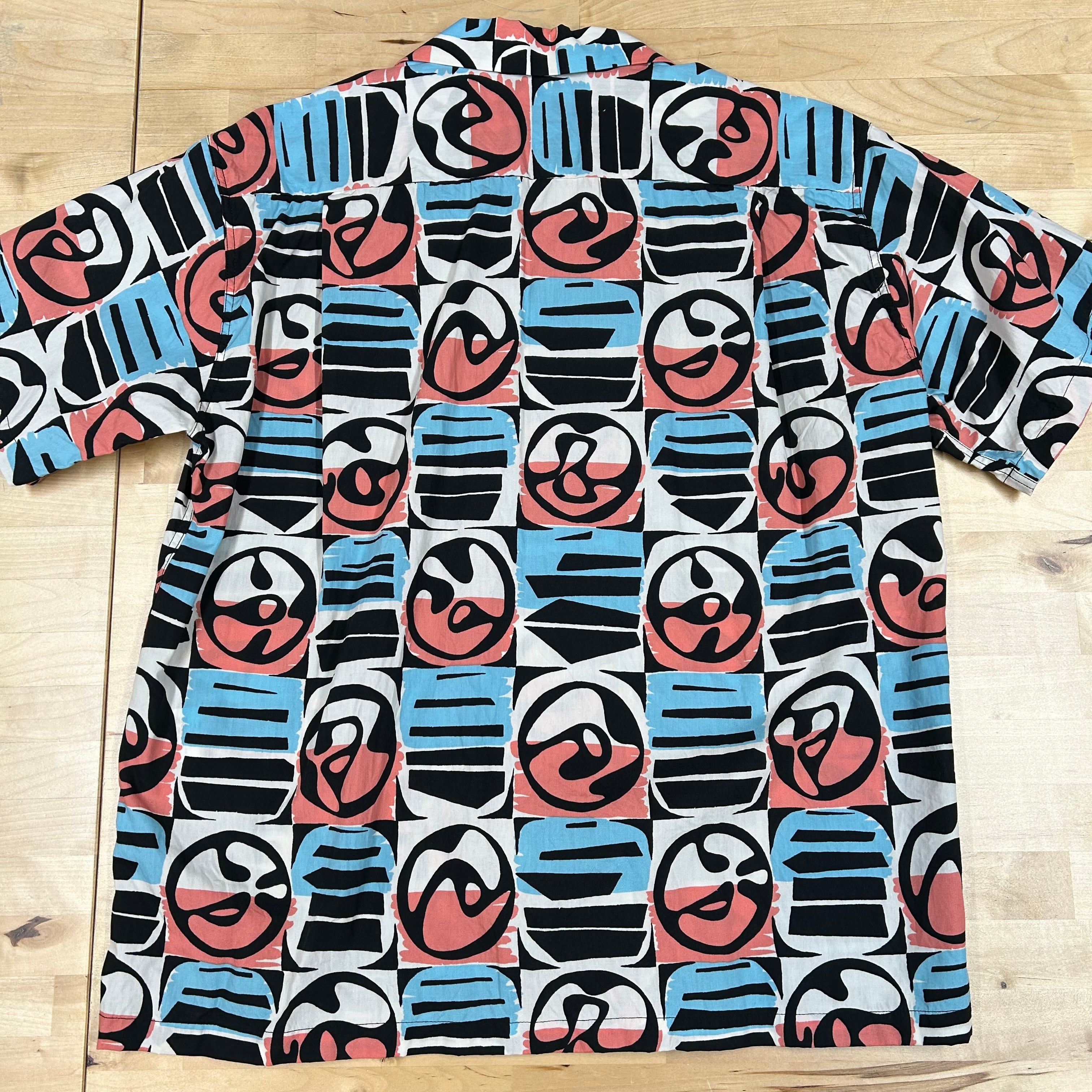 太古に描かれた洞窟の壁画のような民族柄をモチーフとし、1950年代のアメリカで流行した抽象画を連想させる作品。フィフティーズヴィンテージの専門書にも掲載されている有名な絵柄で、丸く緩やかな曲線のモチーフとエッジの効いたスクエアモチーフとのコントラストが程よい緊張感を醸し出す。今季のラインナップはレーヨン生地が多い中、本作はコットン生地に濃色でプリントを施しているので、着用を繰り返して生地とプリントの経年変化を楽しんで欲しい。(サンサーフカタログより)